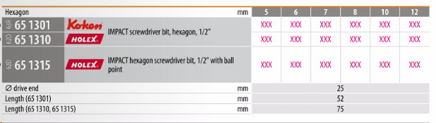IMPACT hexagon screwdriver bit, 1/2 inch 651310 5, 6,7,8,10,12