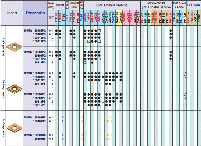 Lưỡi dao DNMG1504... Vật liệu dao :CA025P,CA6515,CA6525,TN620,PV720,PR1535,PR1725,CCX..