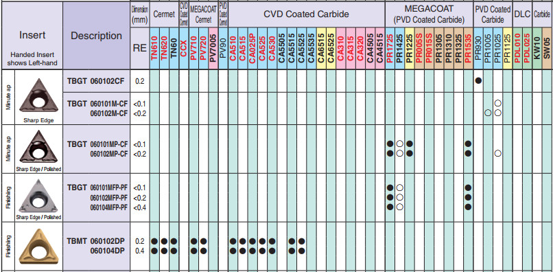 Lưỡi dao TBMT0601... Vật liệu dao : CA025P,CA6515,CA6525,TN620,PV720,PR1535,PR1725,CCX..