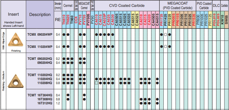 Mảnh dao TCGT1102,..TCET0902... Vật liệu dao :TN60,PV720,PR930,PV7025...