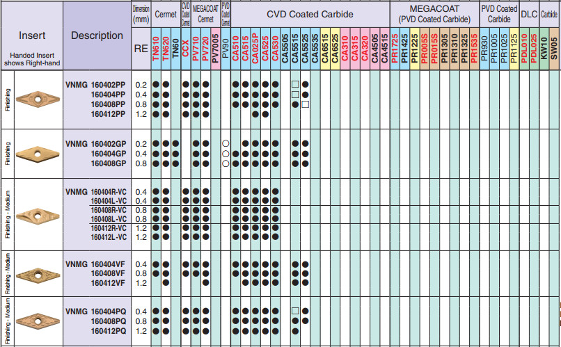 Lưỡi dao VNMG1604... Vật liệu dao : CA025P,CA6515,CA6525,TN620,PV720,PR1535,PR1725,CCX..