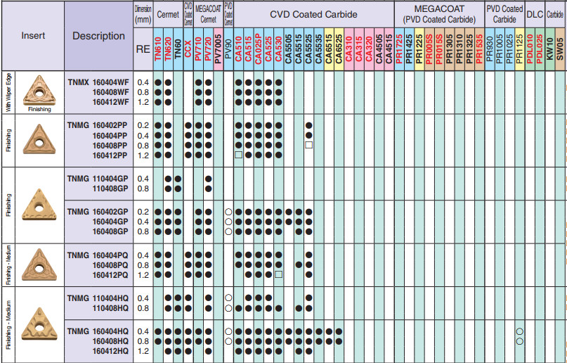 Lưỡi dao TNMG1604... Vật liệu dao : CA025P,CA6515,CA6525,TN620,PV720,PR1535,PR1725,CCX..