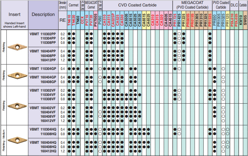 Mảnh dao VBGT1103..,VBET1103... Vật liệu dao :TN60,PV720,PR930,PV7025...