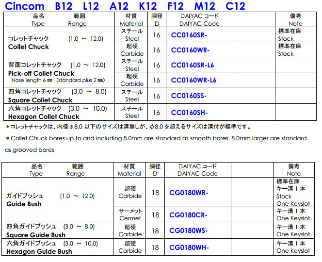 Ống kẹp cho máy cấp phôi tự động Citizen Cincom :Cincom B12,Cincom L12,Cincom A12 ,Cincom K12 ,Cincom F12,Cincom M12,Cincom C12.