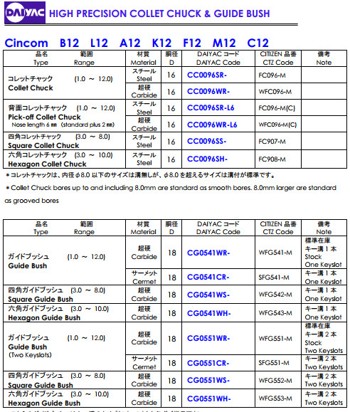 Ống kẹp cho máy cấp phôi tự động Citizen Cincom : Cincom B12,Cincom L12,Cincom A12 ,Cincom K12,Cincom F12,Cincom M12,Cincom C12