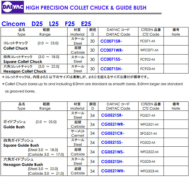 Ống kẹp cho máy cấp phôi tự động Citizen Cincom : Cincom D25,Cincom L25,Cincom F25,Cincom E25