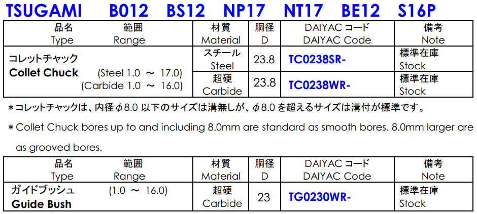 Bộ Collet & Guide bush cho máy cấp phôi tự động TSUGAMI B012,TSUGAMI BS12 ,TSUGAMI NP17,TSUGAMI NT17,TSUGAMI BE12,TSUGAMI S16P