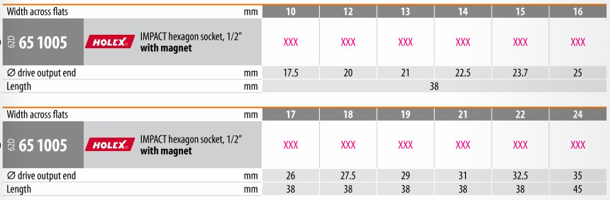 IMPACT hexagon socket, 1/2 inch with magnet Holex 651005 10,12,13,14,15,16 ,17,18,19,21,22,24,30,32,