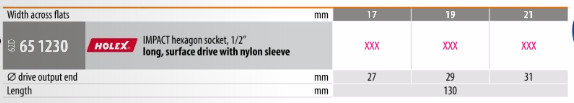 IMPACT hexagon socket, 1/2 inch long, surface drive with nylon Holex 651230 17,19,21